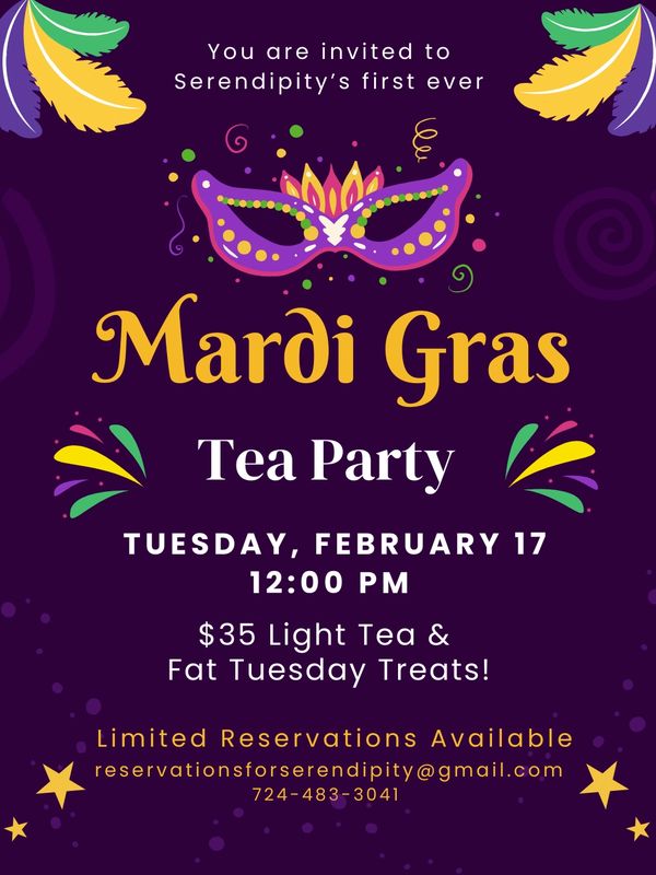 Celebrate Fat Tuesday with us at Serendipity's first ever Mardi Gras Tea Party - Tuesday, February 17 at 12pm.